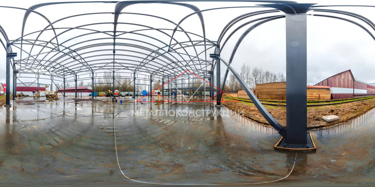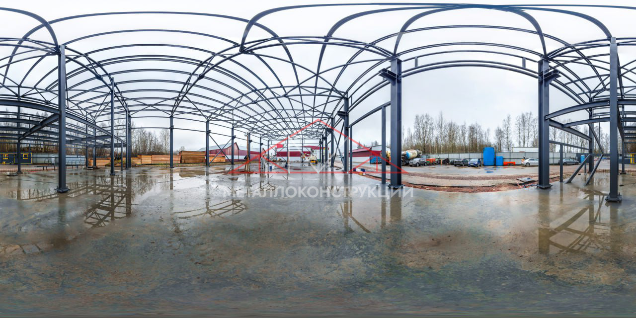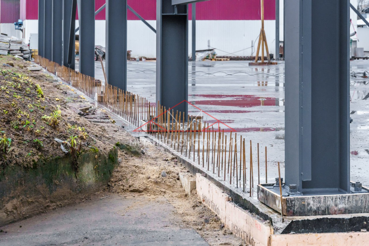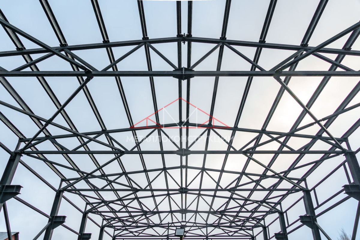 Фундамент выполнен в виде монолитной железобетонной плиты с анкерными группами, которые обеспечивают равномерную передачу нагрузок на основание. Монтаж каркаса осуществлён с применением цифровой геодезии: каждая колонна и ферма выверены с точностью до ±1 мм, поэтому деформация и разрушение здания в будущем исключены.