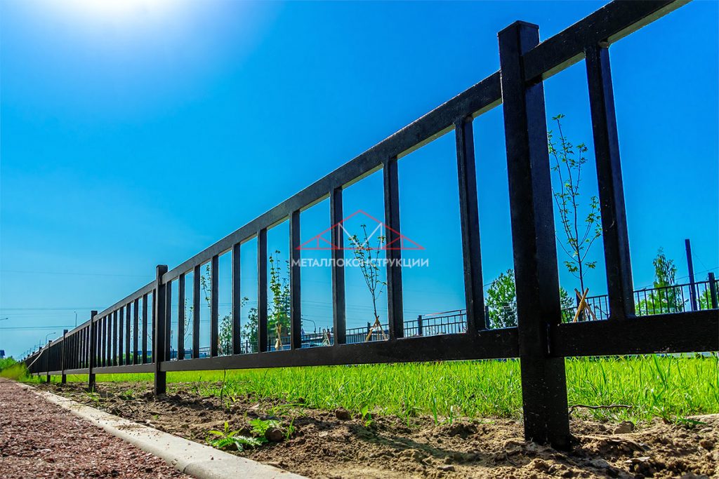 - Ограждения из сварных секций — самый распространённый вид заборов для газонов. В качестве опор берется круглая или профилированная стальная труба, между опорными столбами приваривается рама с решеткой различной степени сложности рисунка. Для изготовления секций используется профтруба или сортовой металлопрокат небольшого сечения. Все элементы соединяются при помощи сварки, что обеспечивает прочность конструкции.