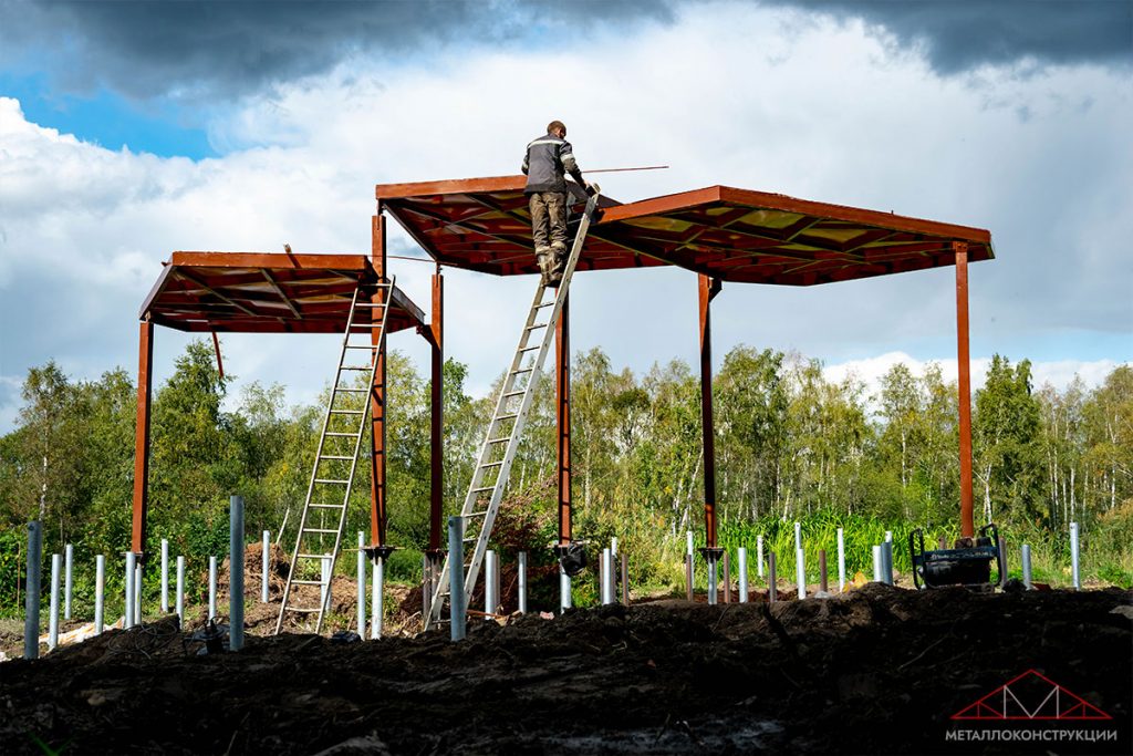 - Монтаж металлоконструкций на месте установки. Опоры фиксируются в грунте с помощью бетонирования, бутования, винтовых или буронабивных свай. По верху столбов привариваются балки обвязки и элементы ферм кровли.